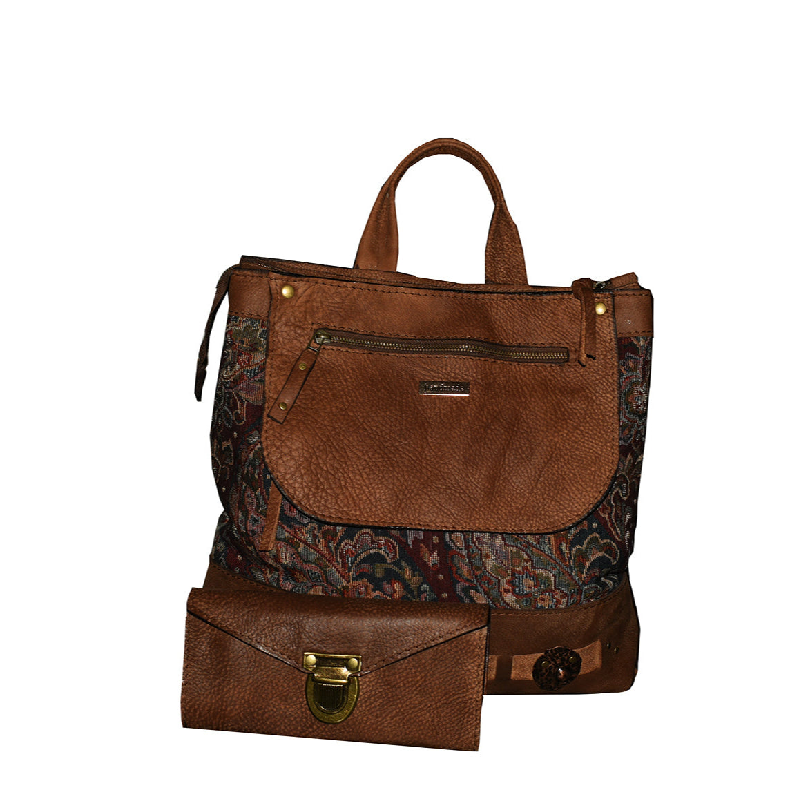 תיק גב גדול יהודית מעור חום אותנטי בשילוב בד ריקמה אתני