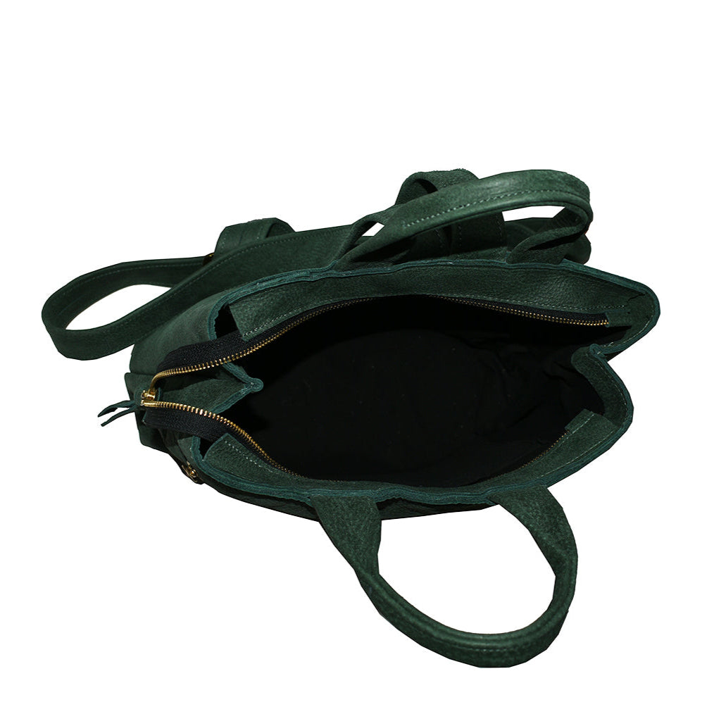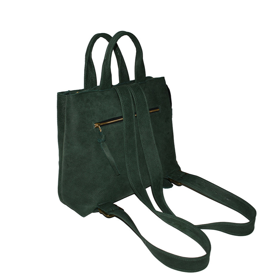תיק גב מעור ירוק יער עם שני רוכסנים אלכסוניים
