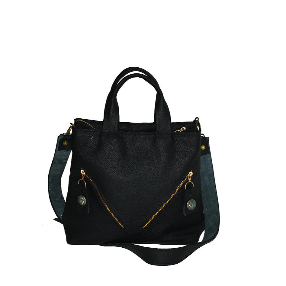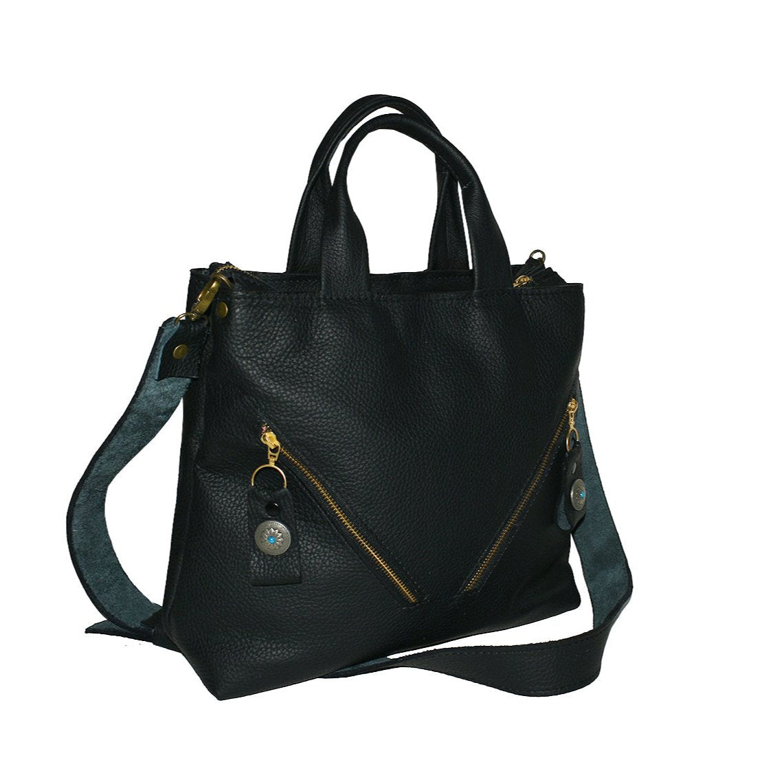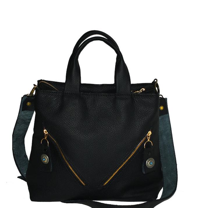 תיק יד מעור שחור עם טקסטורה עם שני רוכסנים אלכסוניים וראשי רוכסן עם סיכה מעוצבת