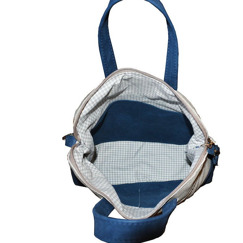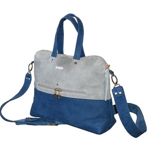 תיק העשוי מעור עם בסיס כחול בשילוב אבן טבעי, כאשר בחזית יש תא עם רוכסן הנפתח לשני הכיוונים.