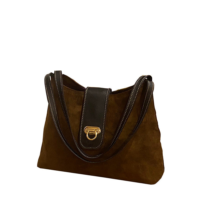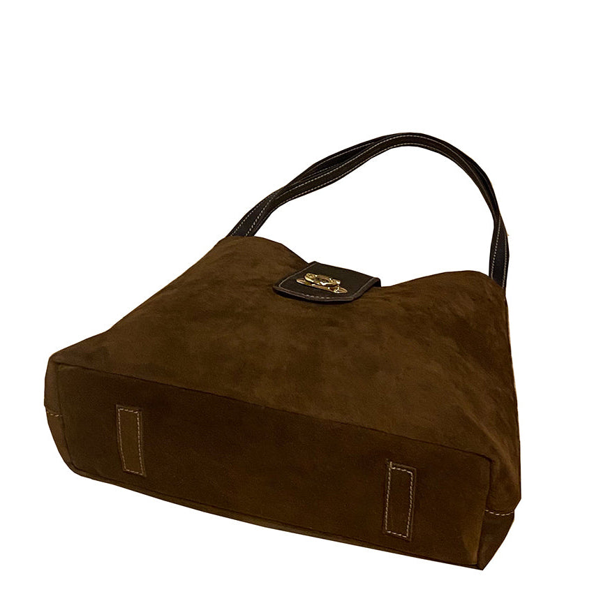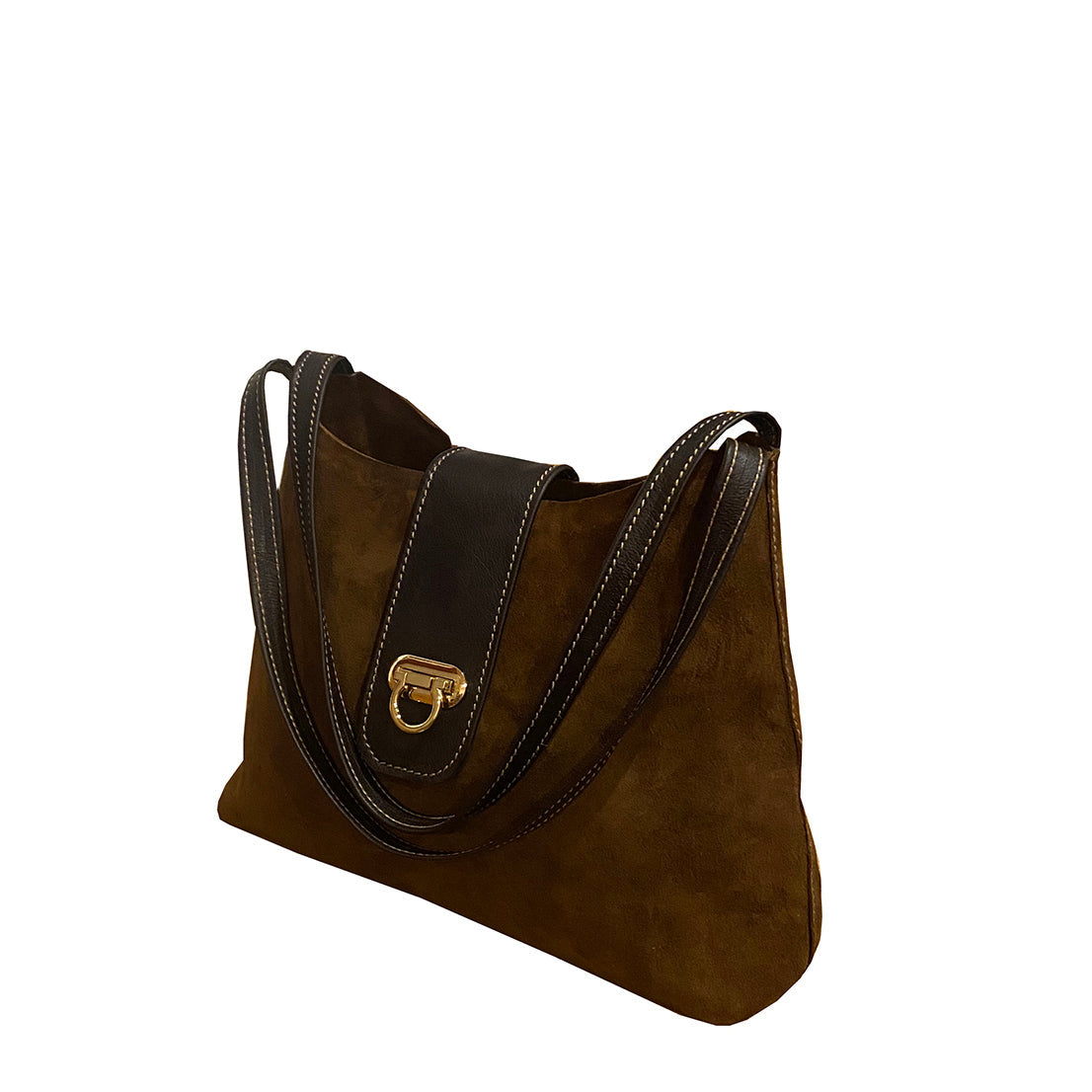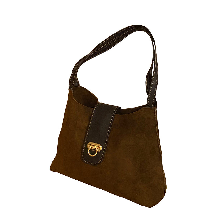 תיק נשיאה מסוגנן מעור זמש חום כהה לתליה על הכתף עם שתי רצועות תליה