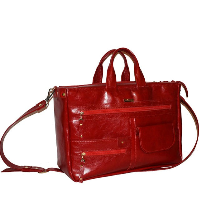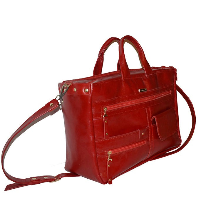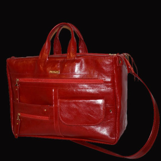 צבע אדום עמוק עשוי מעור אמיתי איטלקי. כולל מספר תאים ומקומות אחסון לפריטים אישיים כמו מחשב נייד, עטים, כרטיסי אשראי ועוד.