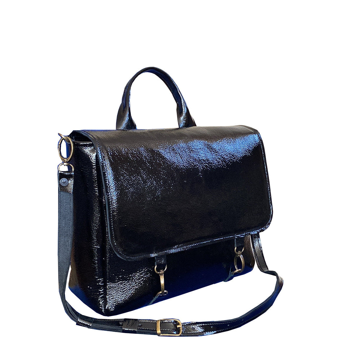 תיק עור לק שחור מהודר ואלגנט עם סגירת קליפסים בצבע עתיק ורצועת אחיזה נוחה
