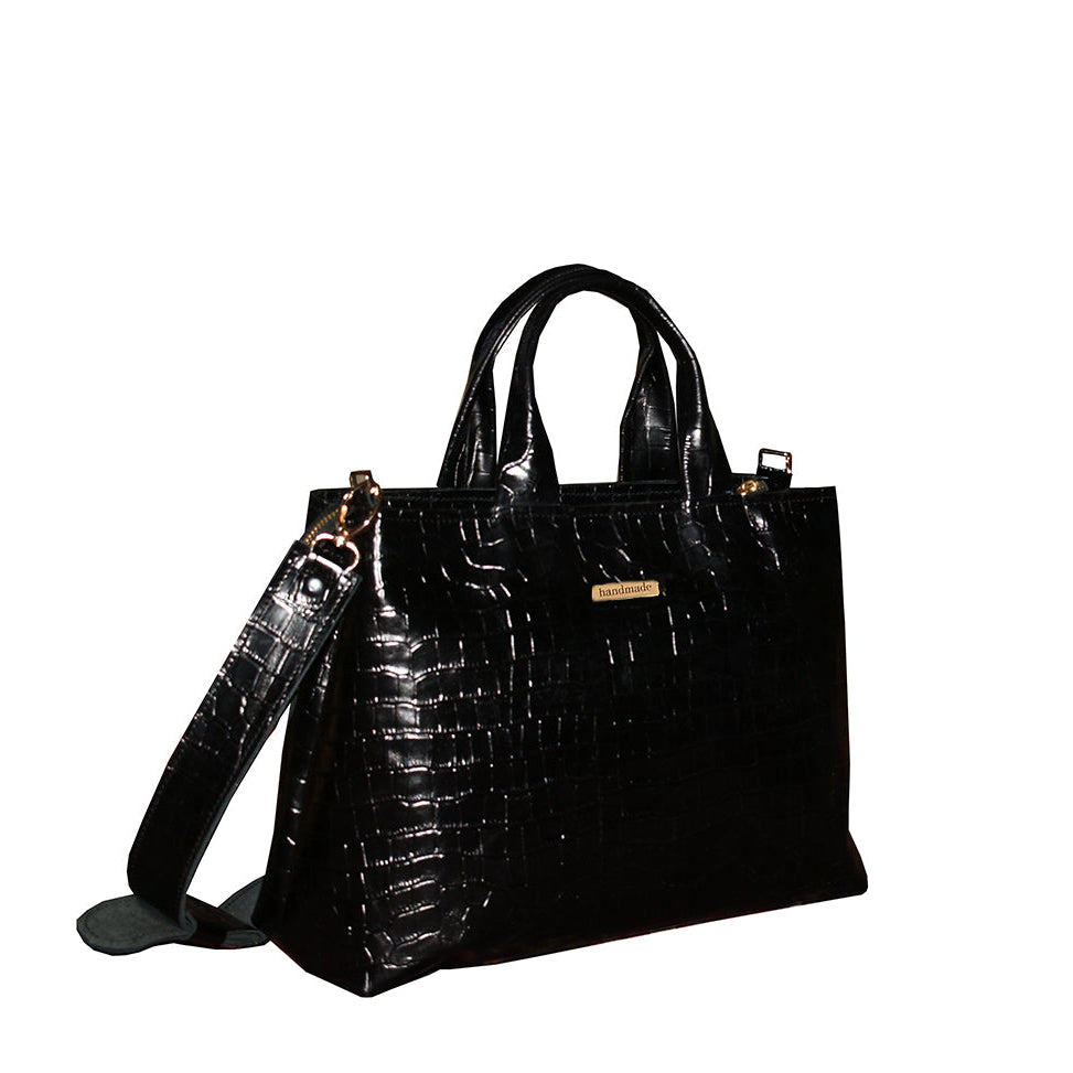 תיק עור שחור קרוקו במראה יוקרתי עם ברק עדין