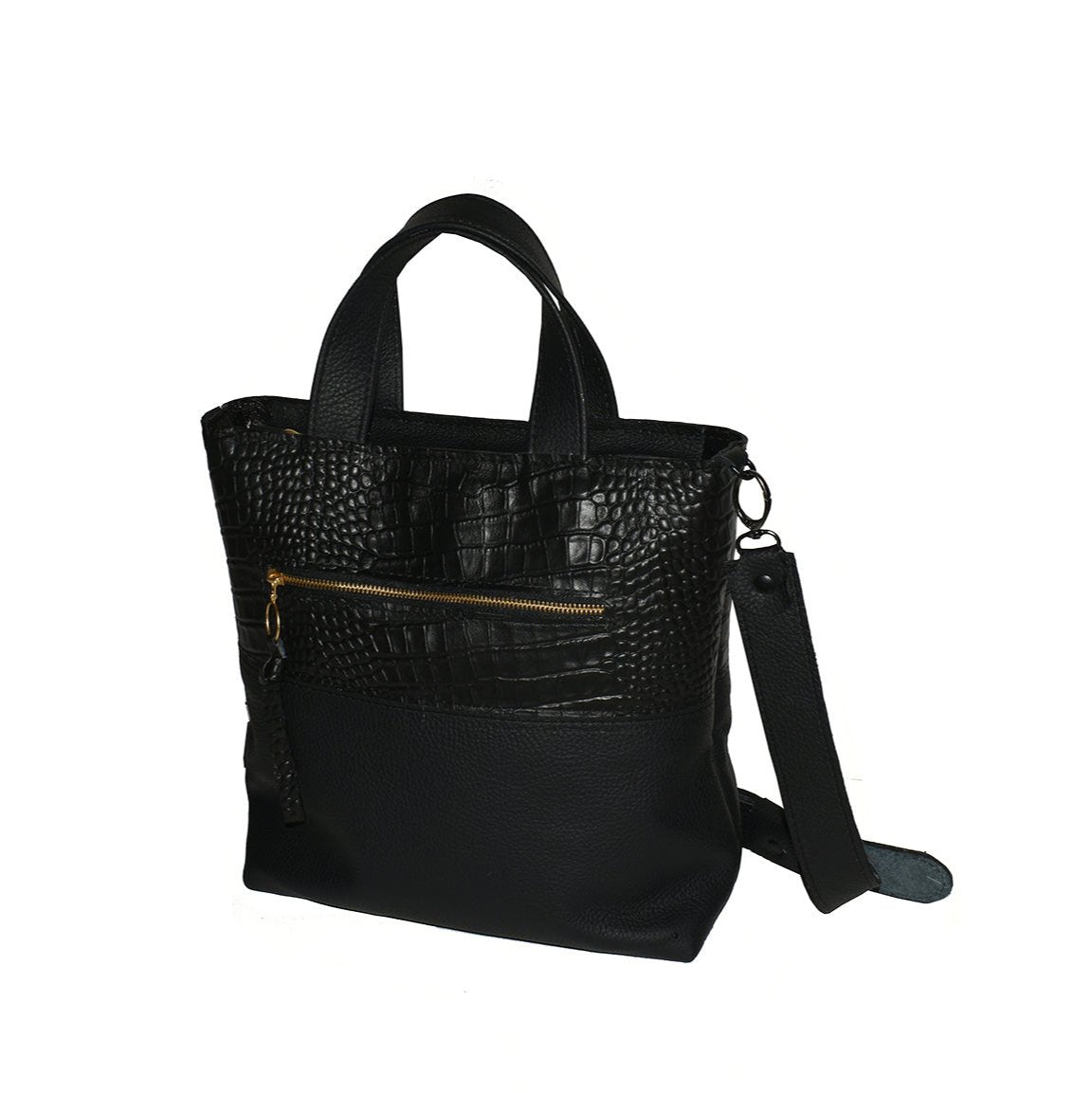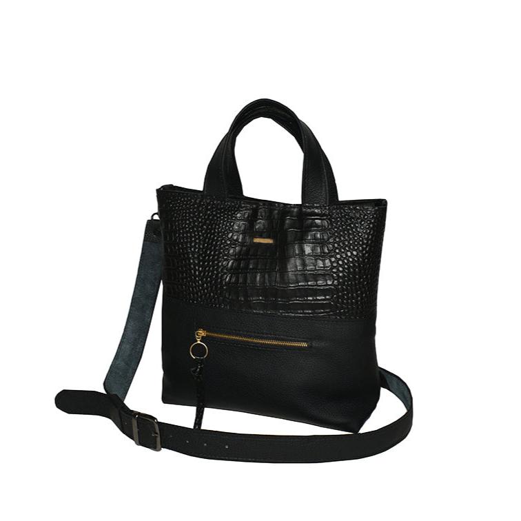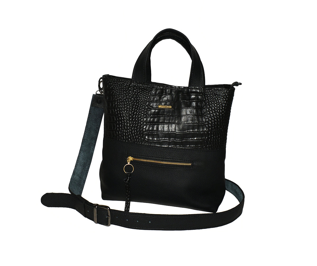 תיק עור שחור (מט או מבריק) אלגנטי מעור קרוקו שחור בשילוב עור שחור עם טקסטורה