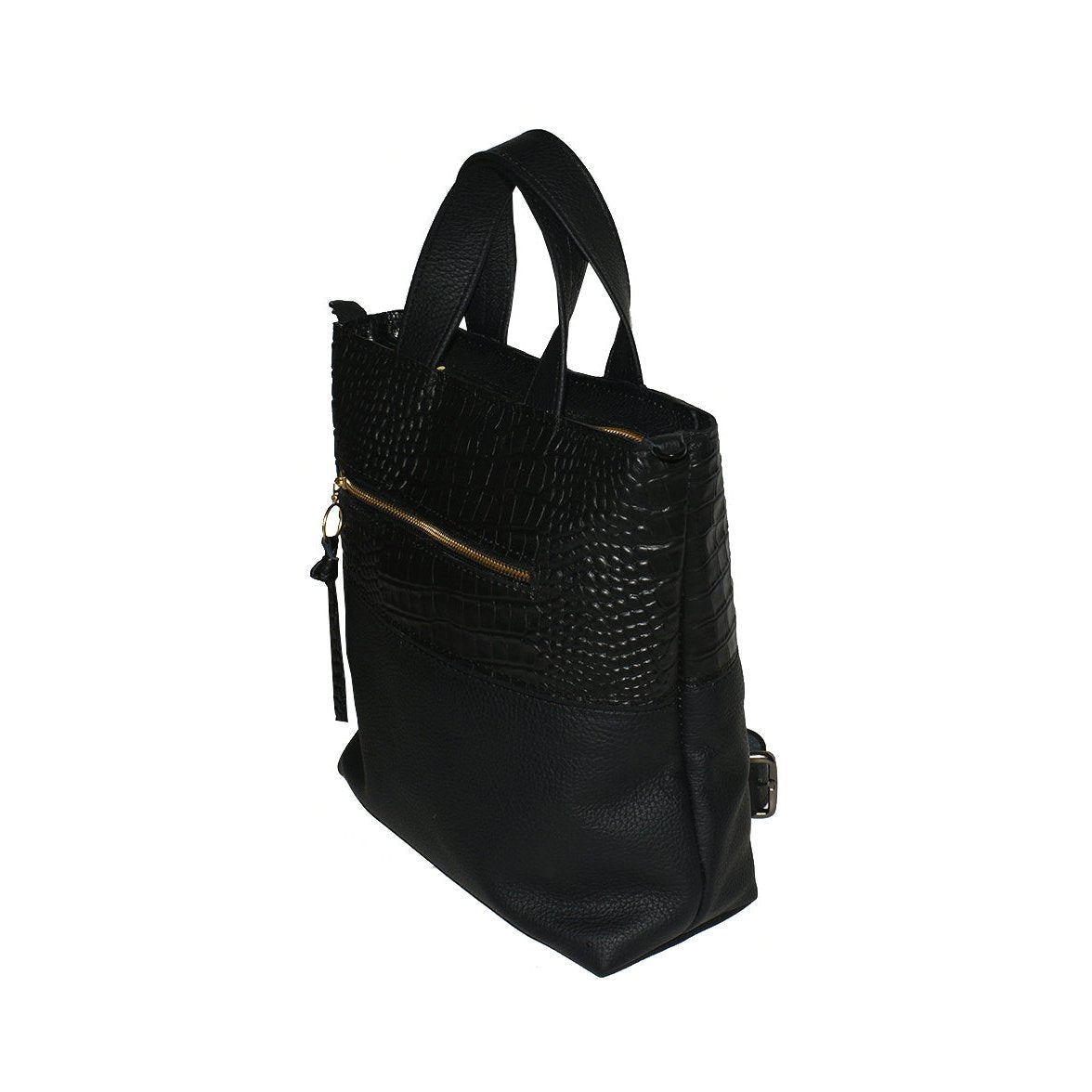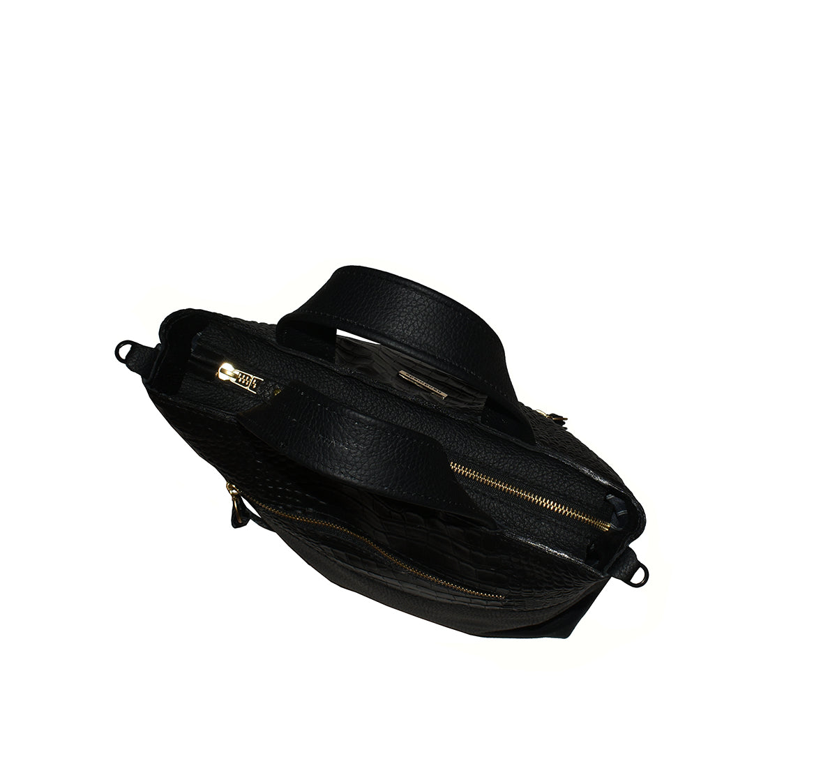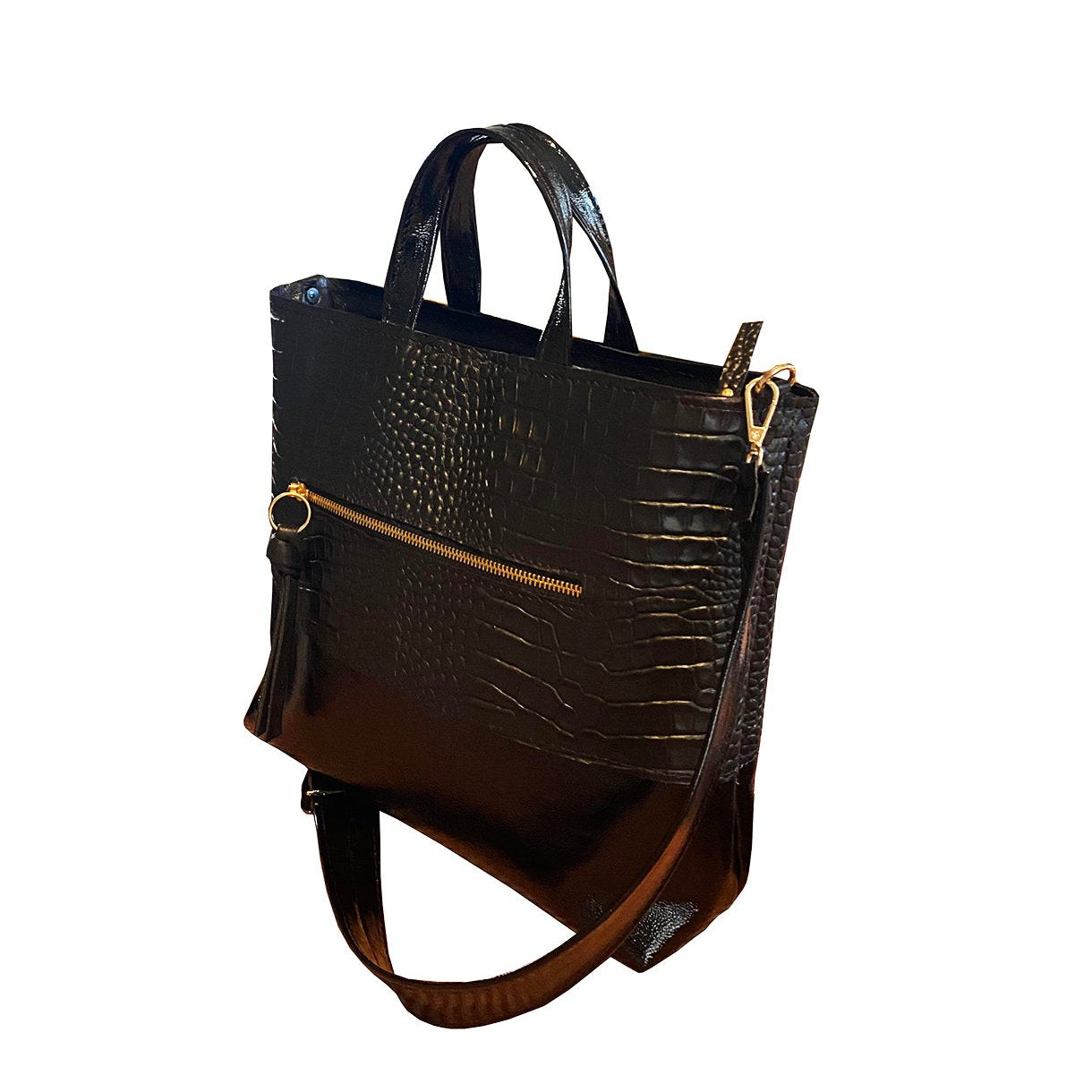 תיק עור שחור (מט או מבריק) אלגנטי מעור קרוקו שחור בשילוב עור שחור עם טקסטורה