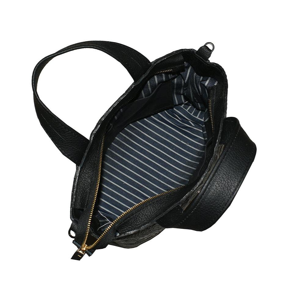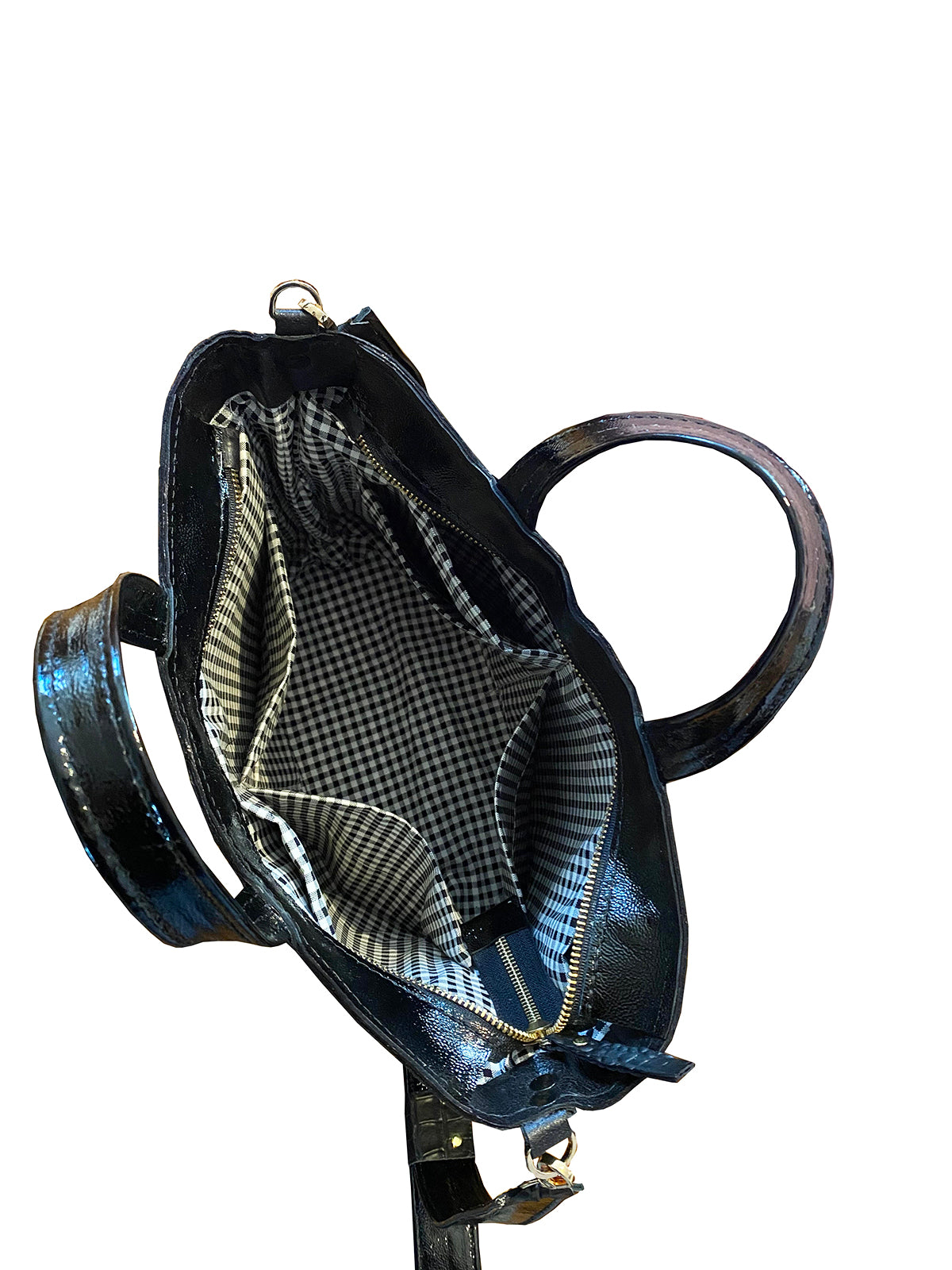 התיק מעור קרוקו שחור המשדר תחכום ועוצמה. בנוסף לעור הקרוקו, הוא משולב בעור שחור חלק עם טקסטורה עדינה, היוצרת קונטרסט מרשים ומראה ייחודי.