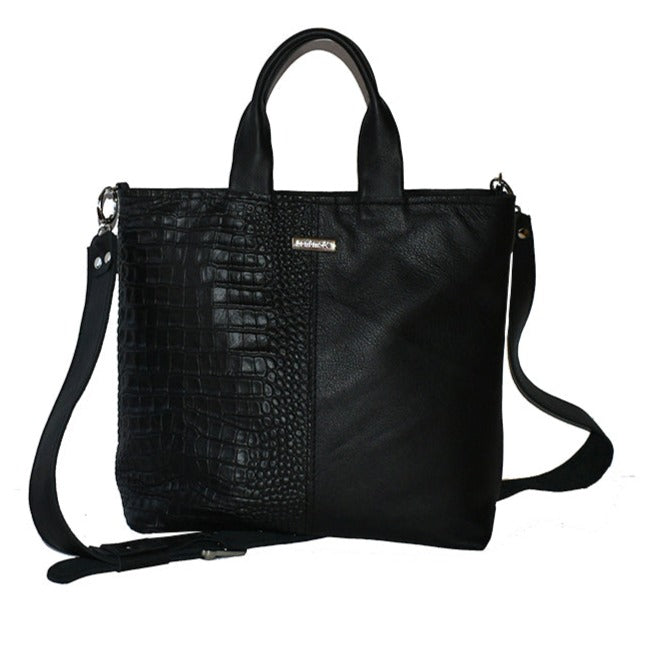 חציו של התיק בעור שחור מט וחציו עור שחור בהדפס תנין יוצרים שילוב מעניין ואופנתי.